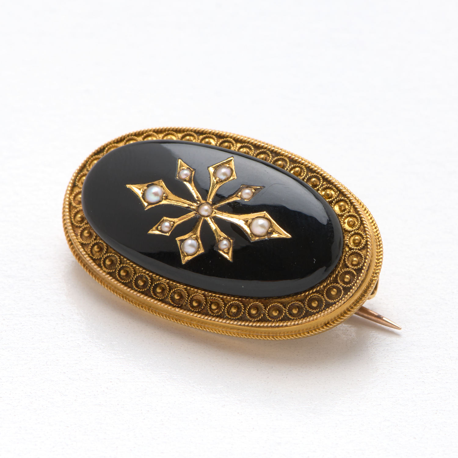 A VICTORIAN SEED PEARL AND ONYX BROOCH IN 20CT GOLD, WITH PIN IN 9CT GOLD, TOTAL LENGTH APPROXIMATELY 34MM, 10.5GMS