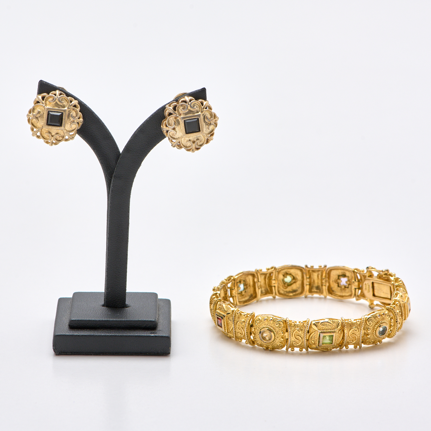 A GEMSTONE SET GOLD PLATED STERLING SILVER BRACELET (WIDTH 11MM, LENGTH 195MM) AND A PAIR SILVER GILT EARRINGS TO POST AND LEVER FITTINGS (DIAMETER 20MM)