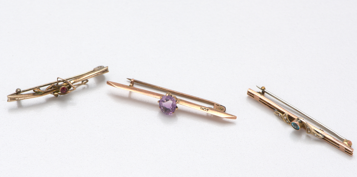 A COLLECTION OF THREE VICTORIAN BAR BROOCHES IN 9CT GOLD AND GOLD PLATE, INCLUDING AMETHYST, SEED PEARL AND TOPAZ SET, WITH PINS IN GOLD PLATE, THE AMETHYST AND TOPAZ SET WEIGHING APPROXIMATELY 4.9GMS