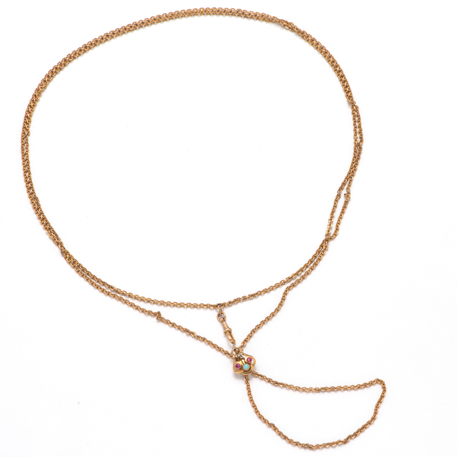 AN ART NOUVEAU GUARD CHAIN IN GOLD PLATE, TO AN OPAL, SEED PEARL AND PINK HARD STONE SET SLIDE IN GOLD LINED METAL, 750MM