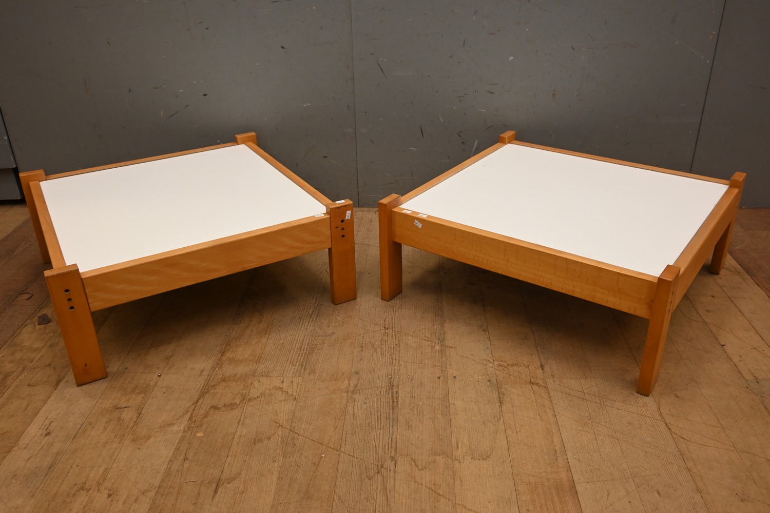 Some marks, stains, and surface scratches present to both coffee tables, all however are consistent with their age and previous use. Some abrasions to the beach frames, mostly around the coffee tables legs and feet. One of the coffee tables has a very slight wobble. Both are structurally sound and there are no major losses. Overall they're both in good condition.