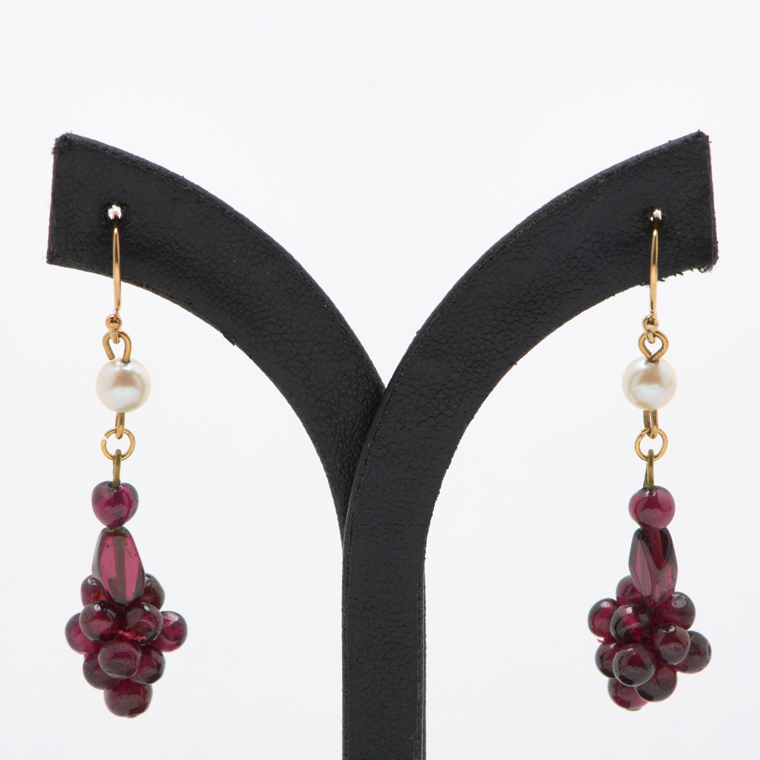 A PAIR OF CULTURED PEARL AND GARNET BEAD EARRINGS, TO SHEPHERDS HOOK FITTINGS IN GOLD PLATE, DROP LENGTH APPROXIMATELY 50MM