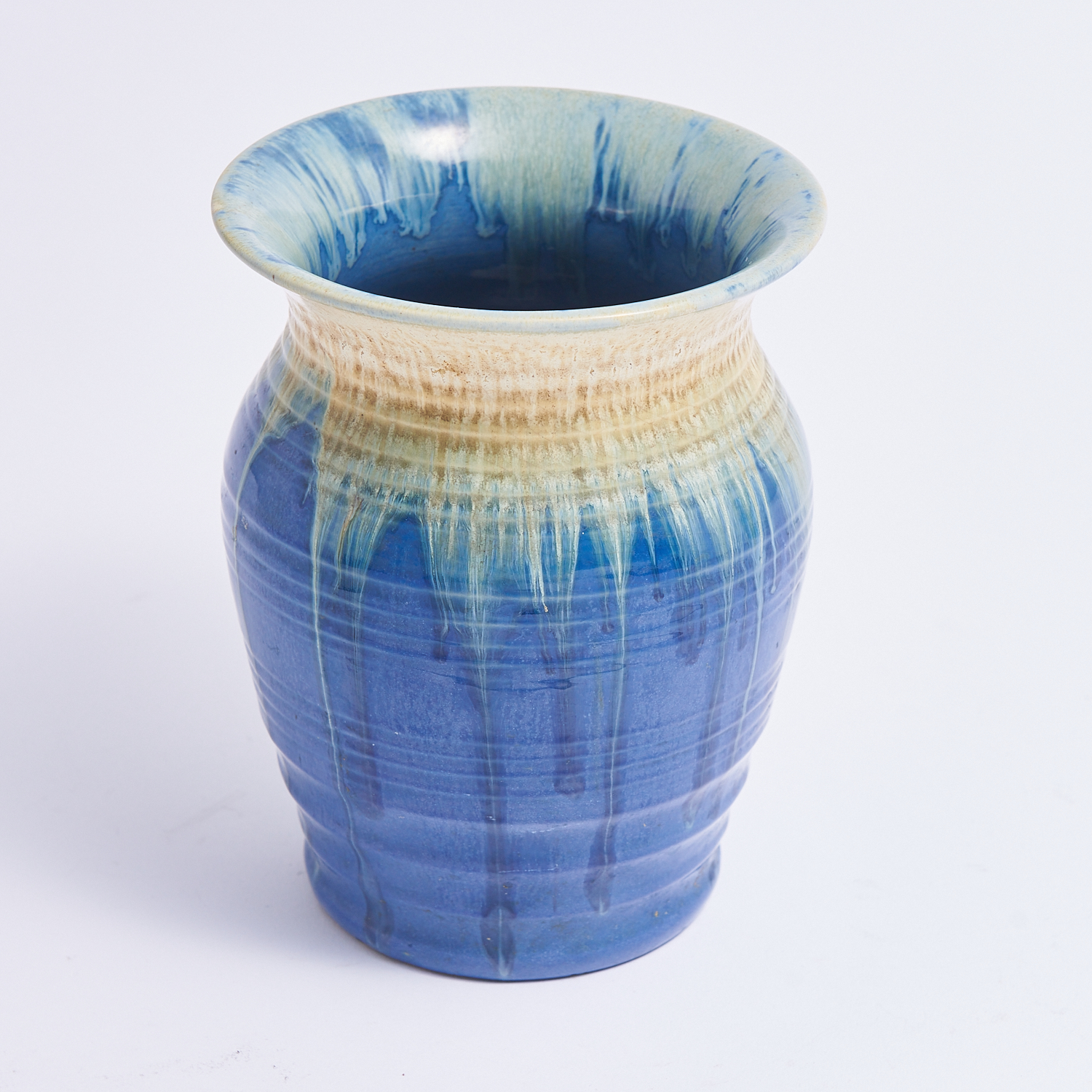 A BLUE AND CREAM REMUED VASE, SIGNED 13-7 H.16CM, LEONARD JOEL LOCAL DELIVERY: SMALL