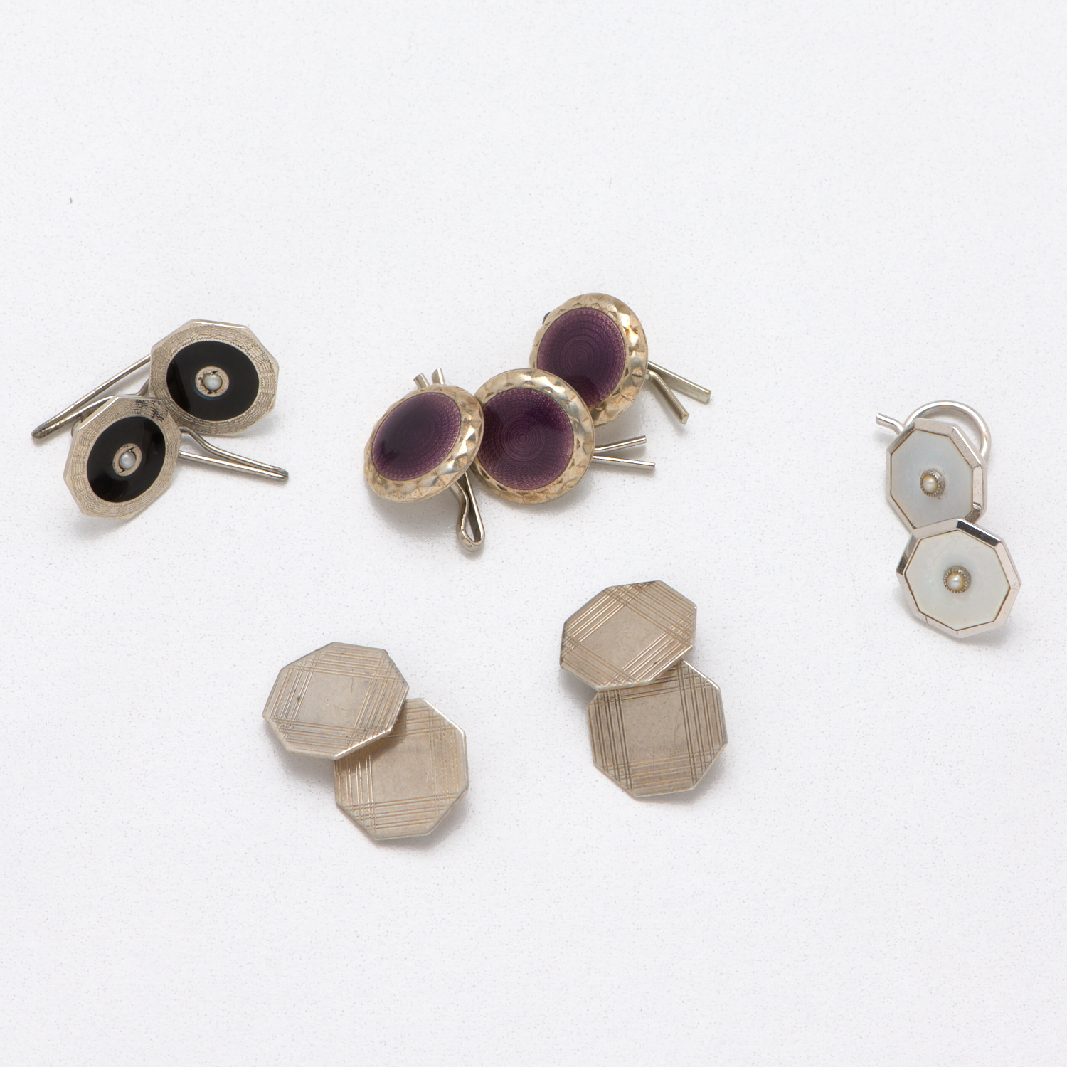 A COLLECTION OF CUFFLINKS AND SHIRT STUDS IN STERLING SILVER, INCLUDING ENAMEL, SEED PEARL AND ONYX SET