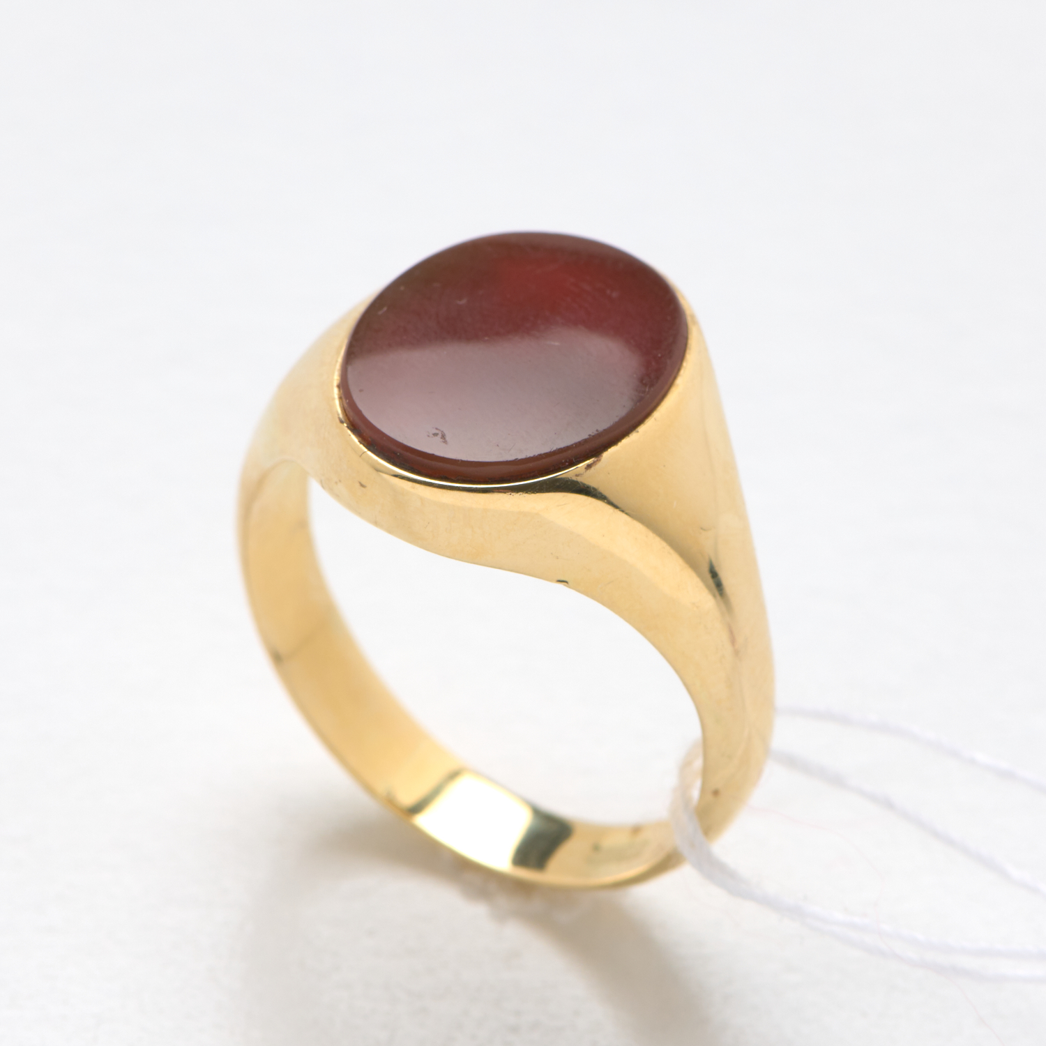 A CARNELIAN SET SIGNET RING IN GOLD, RING SIZE X, 4.2GMS