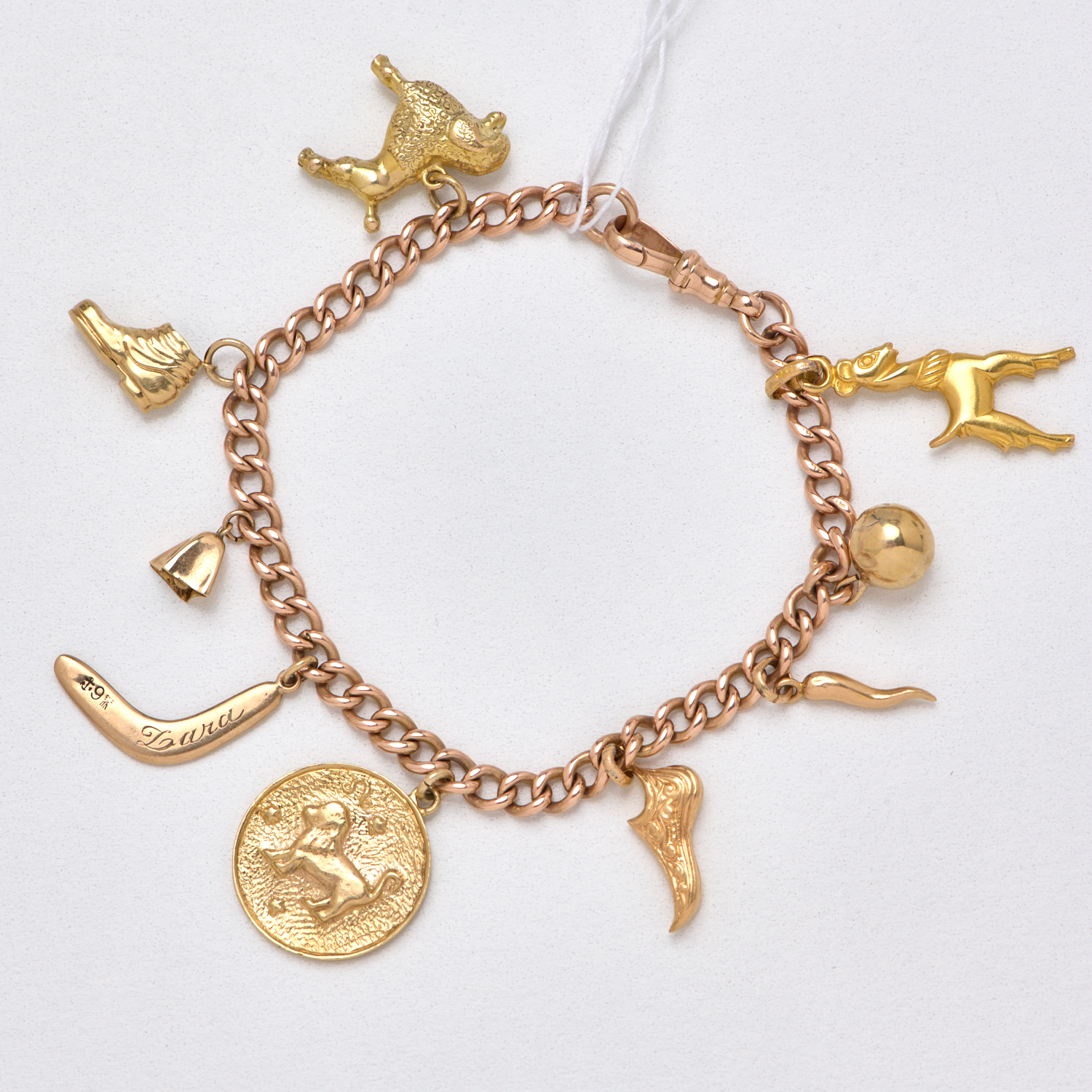 A CHARM BRACELET IN 9CT GOLD WITH CHARMS IN 9CT (DEER AND SHOE IN 18CT APPROX 4GMS), LENGTH 190MM, TOTAL WEIGHT 20.60GMS