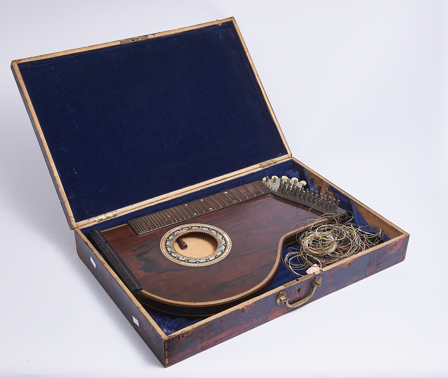 A CASED ZITHER WITH INLAID MOTHER OF PEARL DECORATION (A/F) W.55CM X D.47CM, LEONARD JOEL LOCAL DELIVERY: MEDIUM