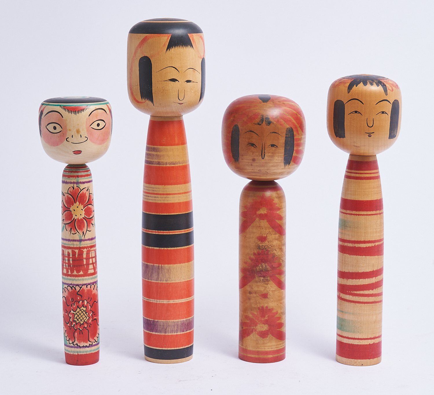 FOUR VINTAGE HAND PAINTED WOODEN KOKESHI DOLLS H.30CM (TALLEST), LEONARD JOEL LOCAL DELIVERY: MEDIUM