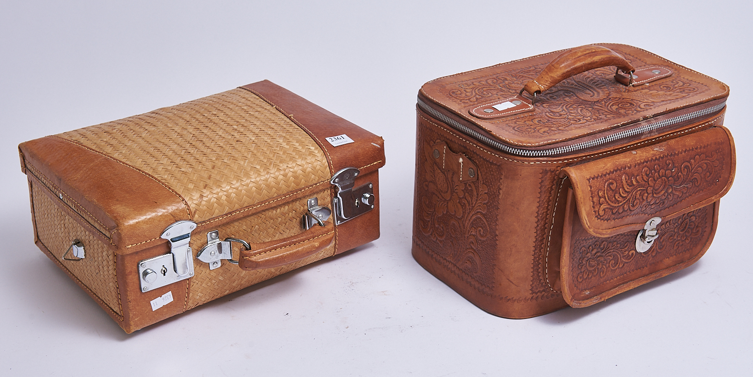 TWO VINTAGE TRAVELLING CASES INCLUDING ONE WITH WOVEN RATTAN H.19CM X W.30CM X D.23CM (LARGEST), LEONARD JOEL LOCAL DELIVERY: MEDIUM