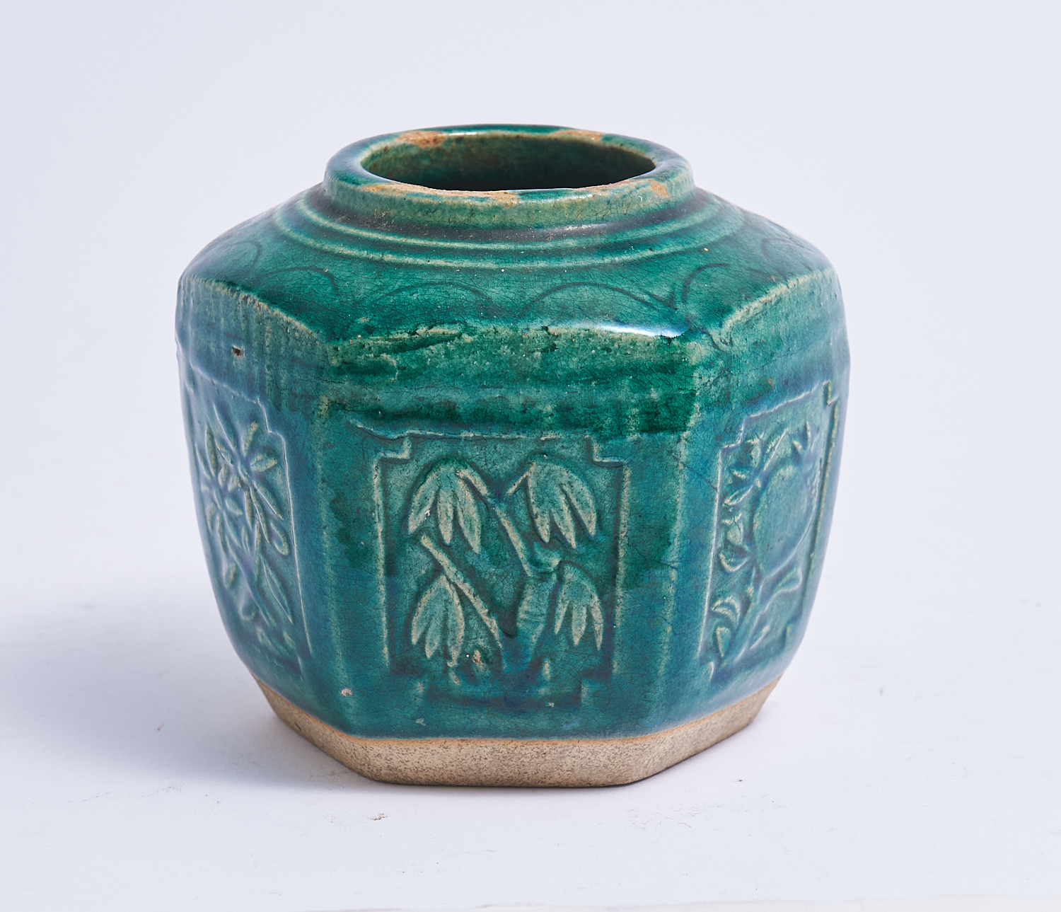 A CHINESE GREEN GLAZED POTTERY HEXAGONAL FORM JAR , H.13CM, LEONARD JOEL LOCAL DELIVERY: SMALL