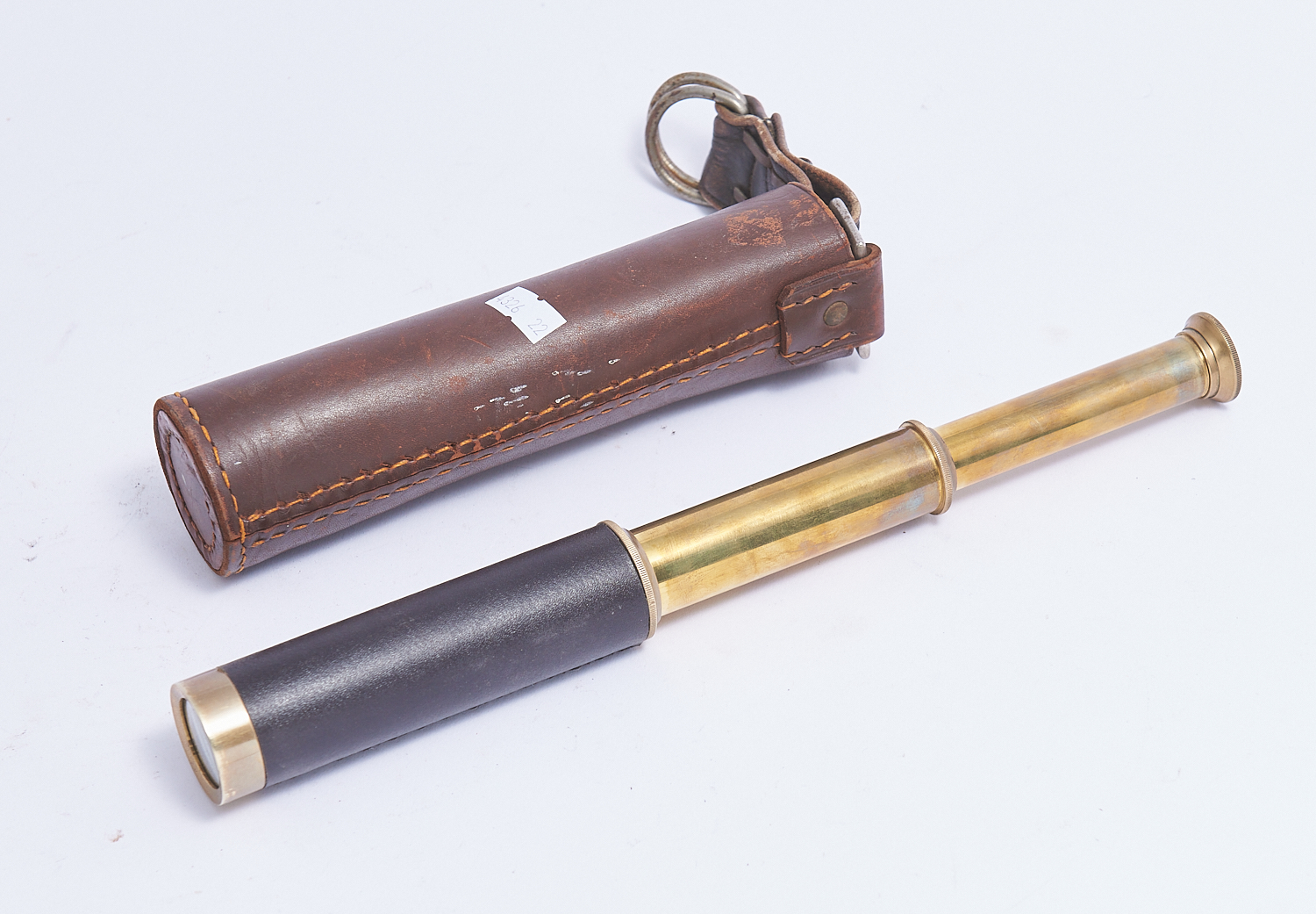 A LEATHER COVERED THREE DRAW BRASS TELESCOPE, WITH CASE L.20CM, LEONARD JOEL LOCAL DELIVERY: SMALL