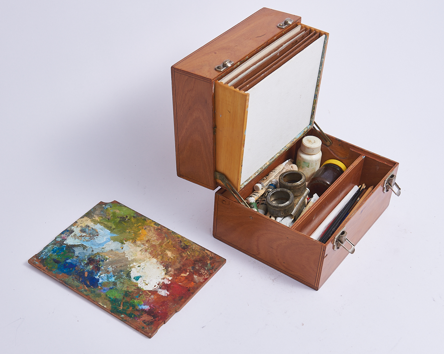A WOODEN ARTISTS TRAVELLING CASE WITH INTERNAL PAINT PALETTE PAINTS BRUSHES BRUSH POT ETC H.15CM X W.22.5CM X D.17.5CM, LEONARD JOEL LOCAL DELIVERY: SMALL