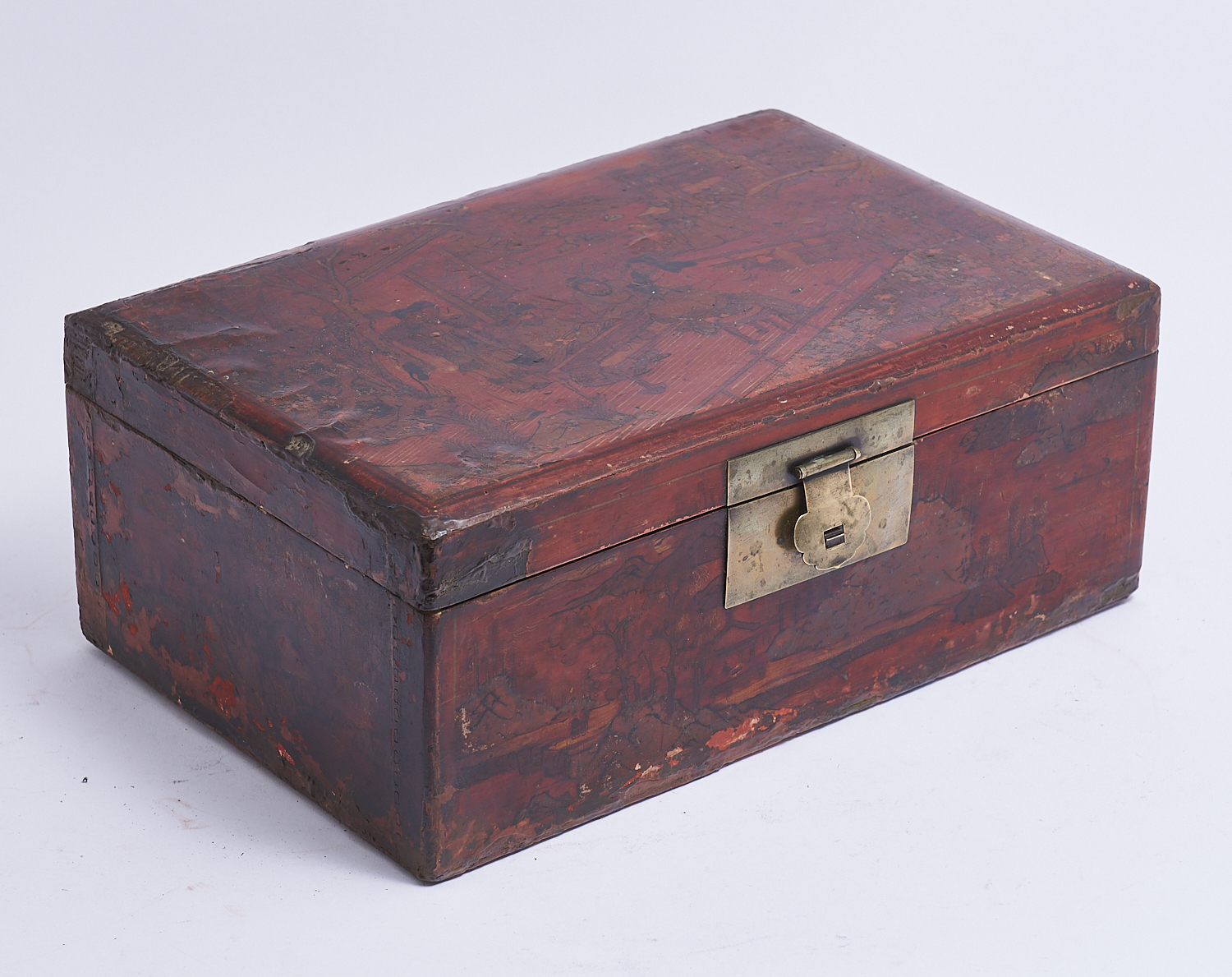A CHINESE HAND PAINTED WOODEN DOCUMENT BOX WITH BRASS LATCH H.14.5CM X W.36.5CM X D.24.5CM, LEONARD JOEL LOCAL DELIVERY: MEDIUM