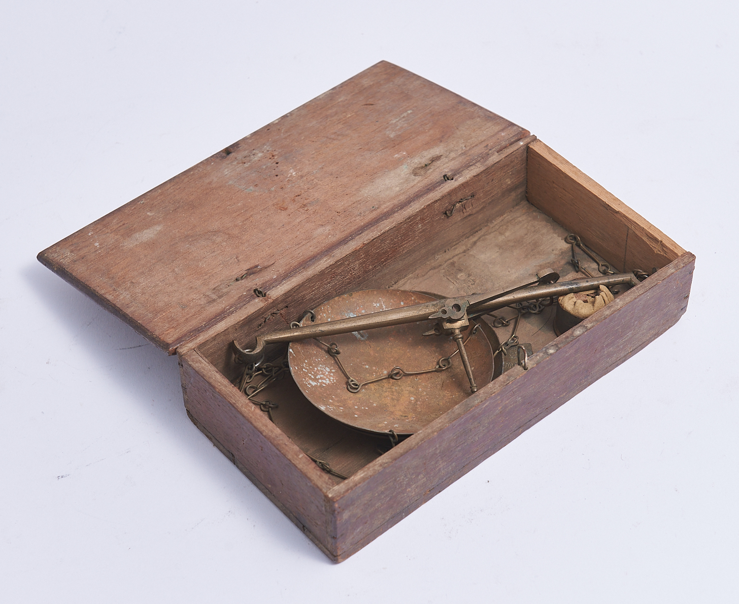 AN ANTIQUE SET OF CEDAR CASED BRASS MINERS SCALES H.5.5CM X W.22CM X D.12CM, LEONARD JOEL LOCAL DELIVERY: SMALL