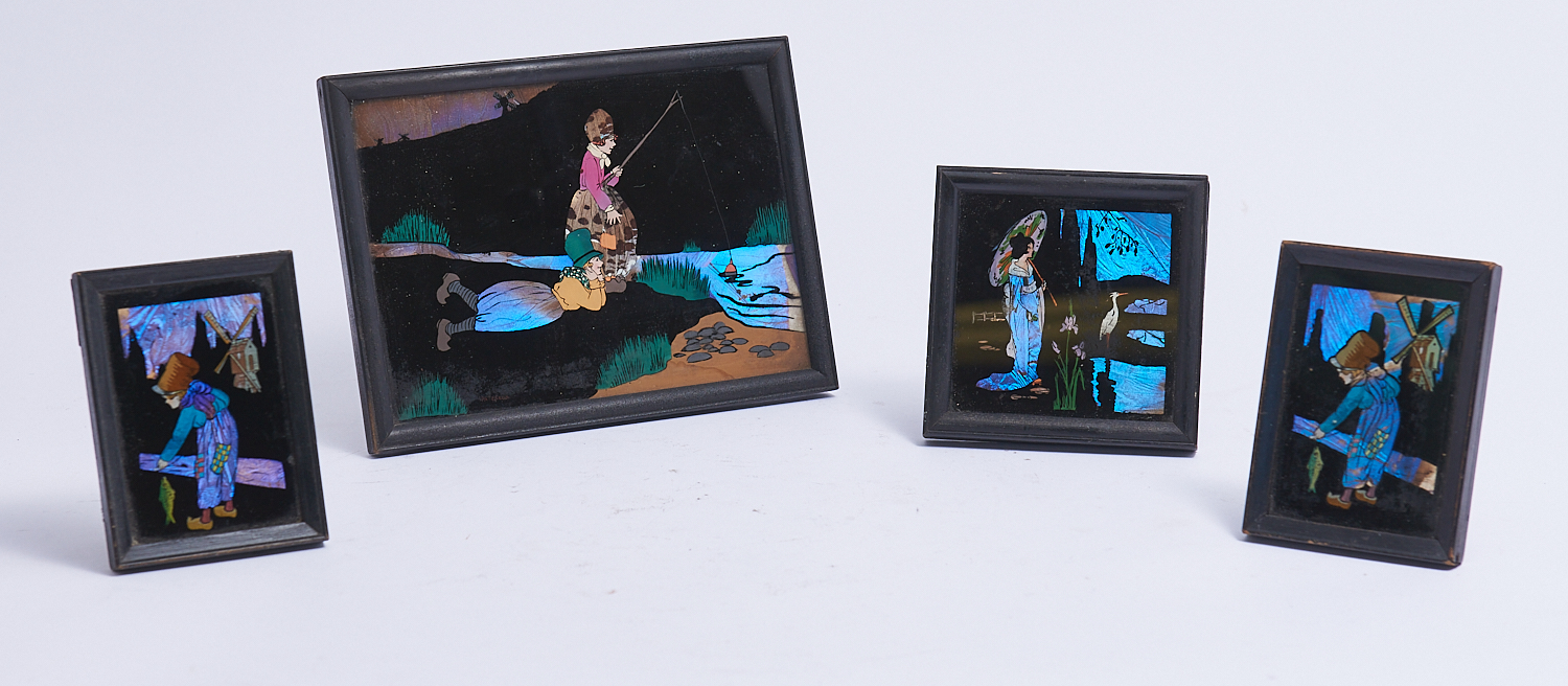 GROUP OF FOUR 1920S NATURAL BUTTERFLY WING PICTURES WITH ORIGINAL LABELS – MADE IN ENGLAND H.14CM X W.19CM (LARGEST), LEONARD JOEL LOCAL DELIVERY: SMALL
