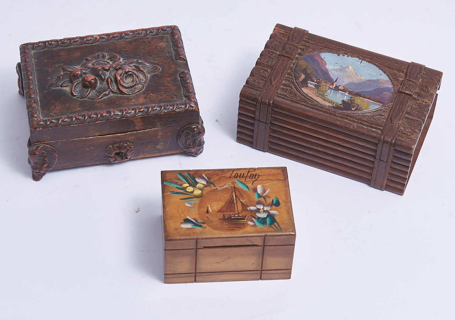 THREE ANTIQUE HAND PAINTED AND CARVED EUROPEAN WOODEN BOXES H.6CM X W.12CM X D.8.5CM (LARGEST), LEONARD JOEL LOCAL DELIVERY: SMALL