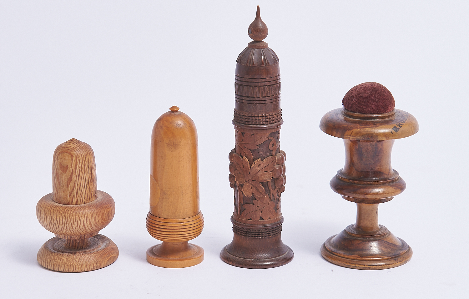 FOUR ANTIQUE TREEN SEWING HOLDERS FOR NEEDLES THIMBLES AND COTTON H.13CM, LEONARD JOEL LOCAL DELIVERY: SMALL