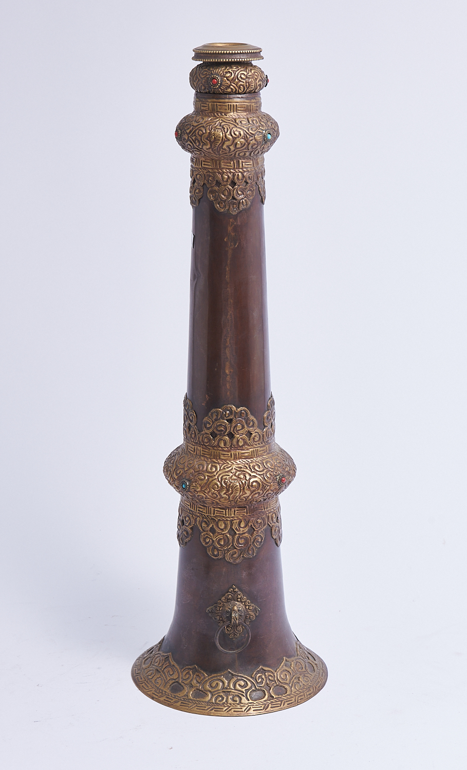 A COPPER AND BRASS TIBETAN HORN WITH INLAID TURQUOISE AND CORAL H.57.5CM, LEONARD JOEL LOCAL DELIVERY: MEDIUM