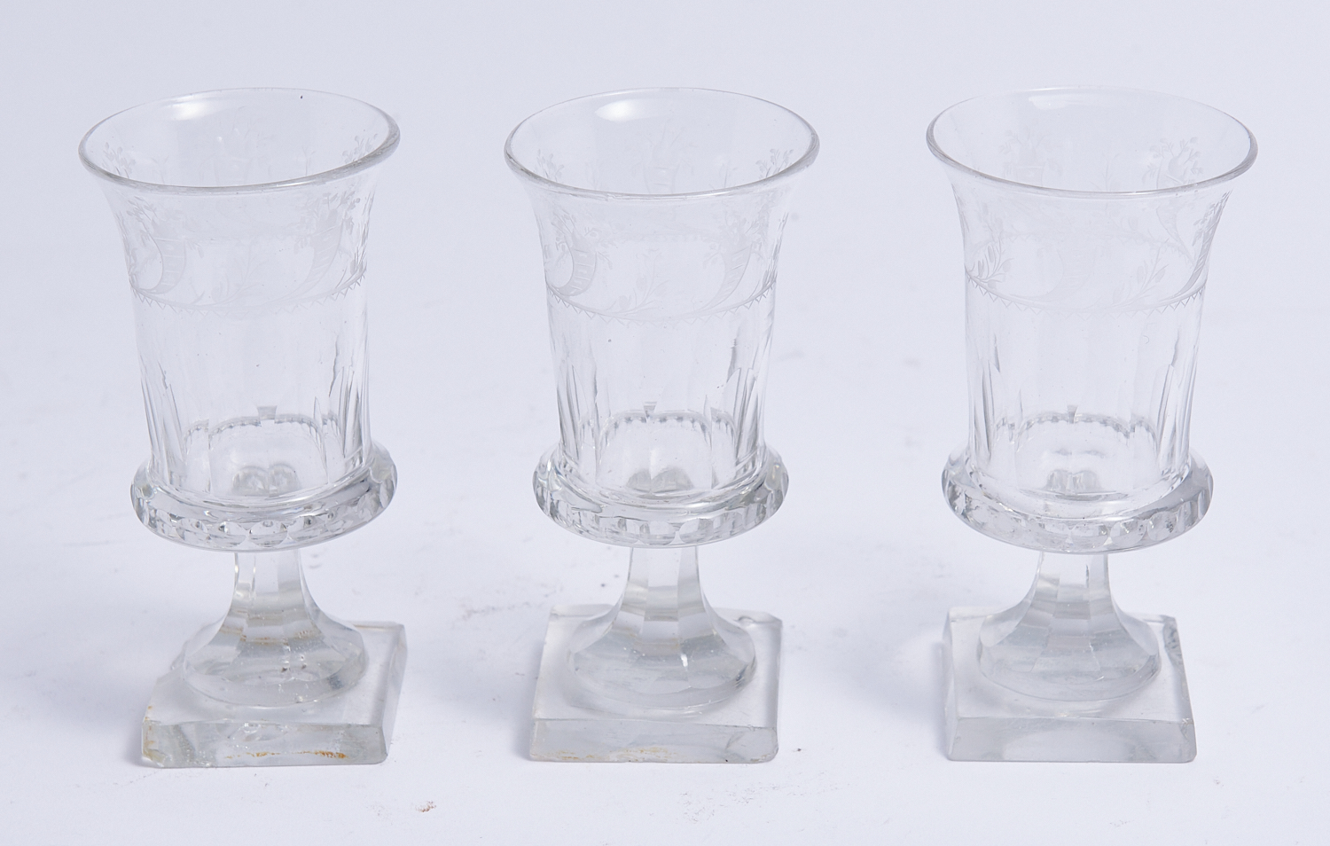 THREE ENGRAVED GLASSES WITH SQUARE FORM BASES (A/F) H.12.5CM, LEONARD JOEL LOCAL DELIVERY: SMALL