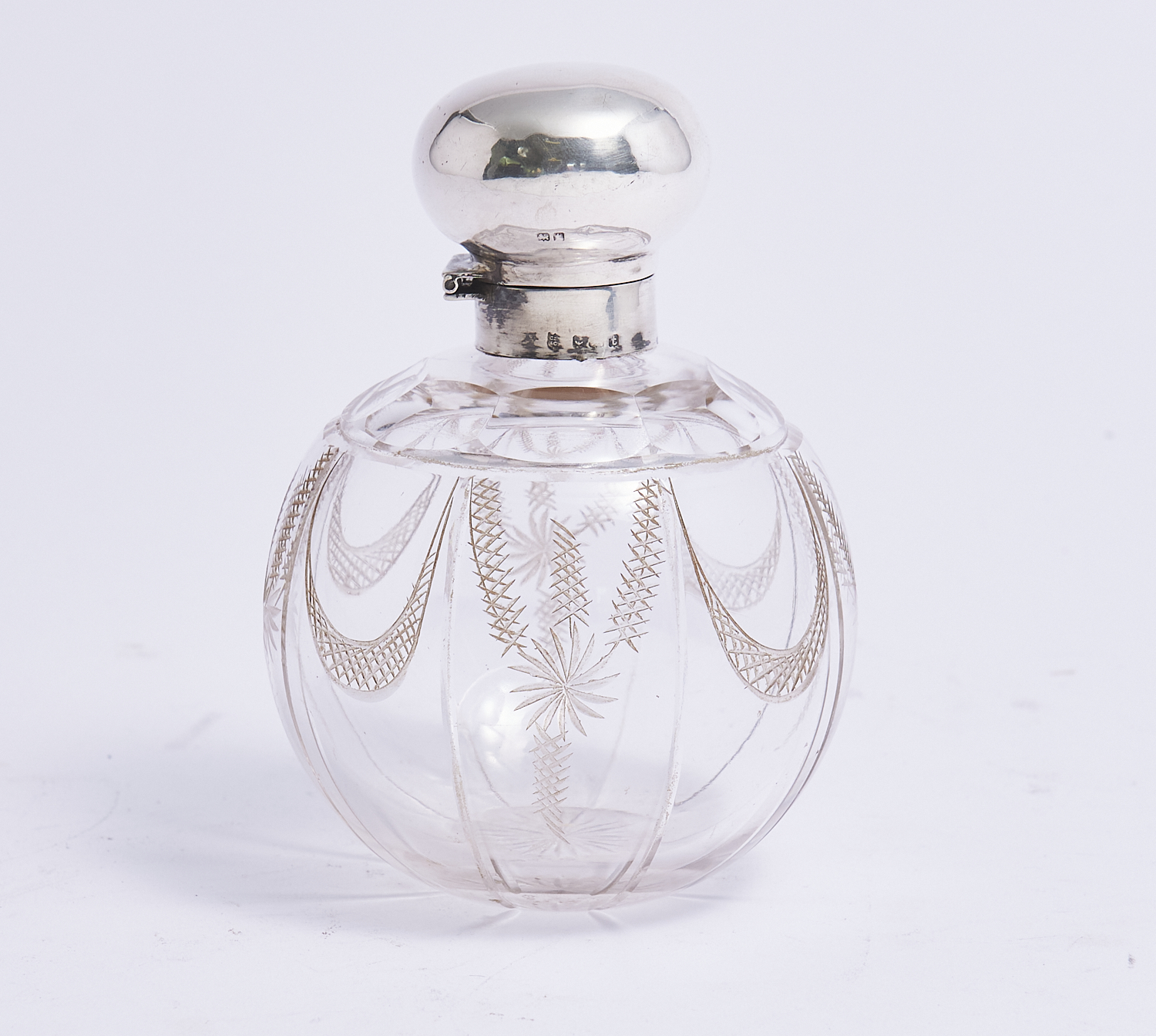 A STERLING SILVER TOPPED CUT CRYSTAL PERFUME BOTTLE WITH STOPPER AND ENGRAVED DECORATION, H.12CM, LEONARD JOEL LOCAL DELIVERY: SMALL