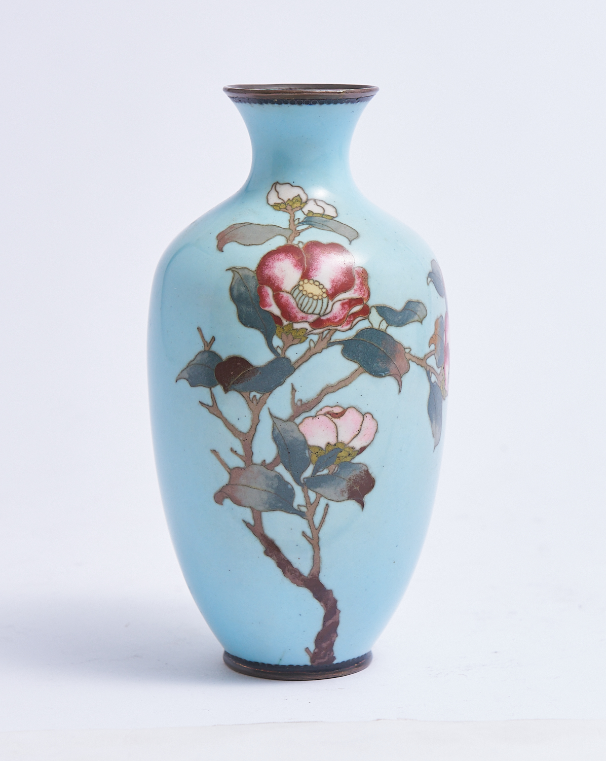 A CHINESE FLORAL DECORATED BLUE GROUND CLOISONNE VASE, H.18CM, LEONARD JOEL LOCAL DELIVERY: SMALL