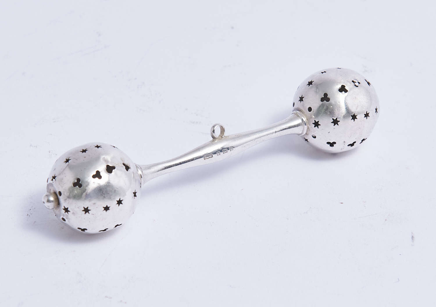 A STERLING SILVER DOUBLE END BAR BELL FORM BABIES RATTLE W.11.5CM, LEONARD JOEL LOCAL DELIVERY: SMALL