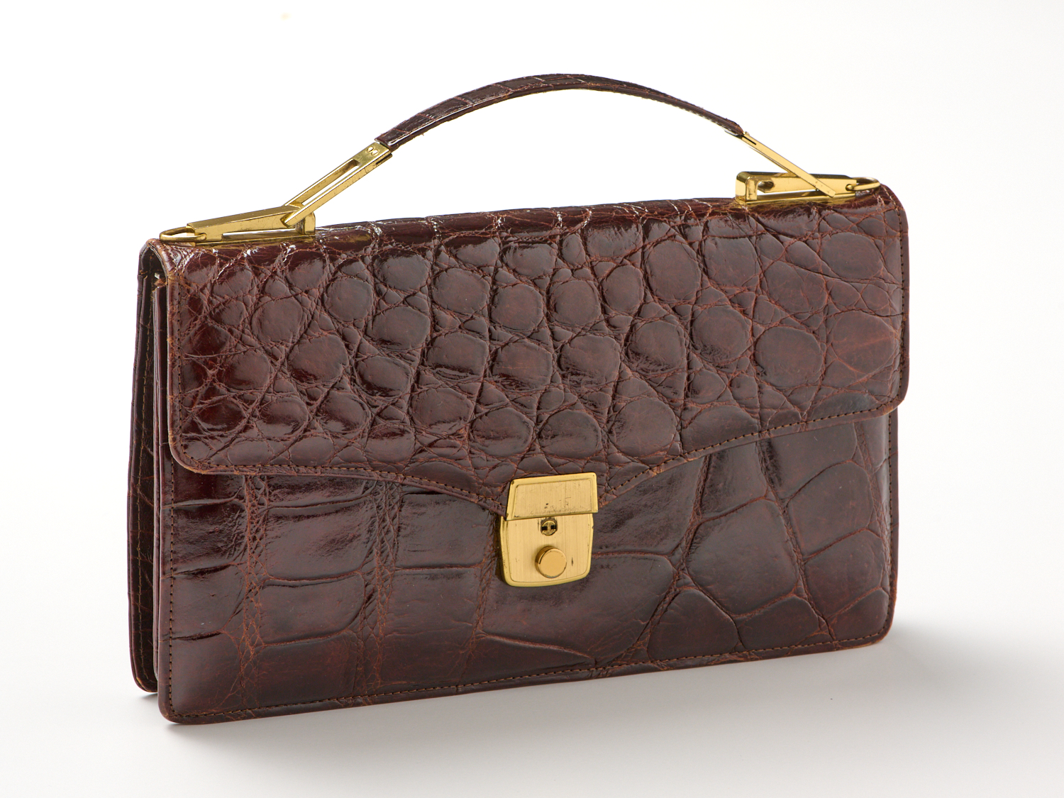 A VINTAGE TOP HANDLE CLUTCH - Styled in chocolate crocodile leather, with full leather interior and gold tone hardware, 28 x 19 x 3cm.