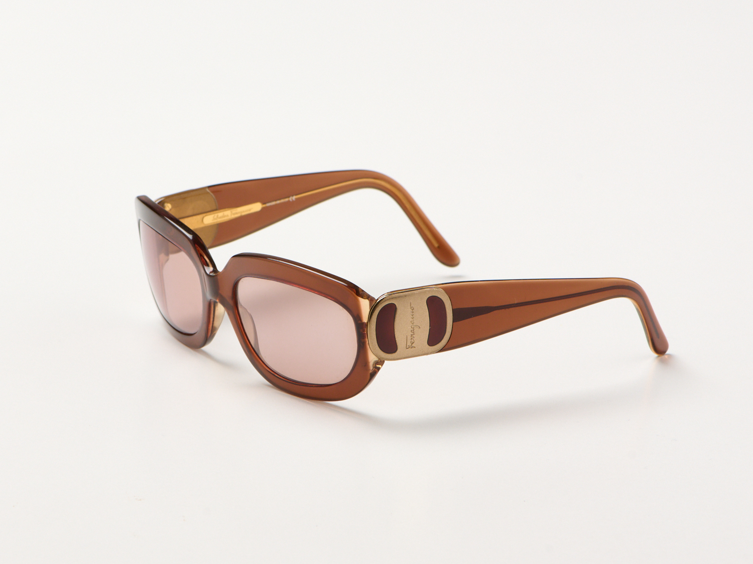 A PAIR OF PRESCRIPTION SUNGLASSES BY SALVATORE FERRAGAMO - Styled in toffee composite with soft gold Ferragamo plaques at temples.