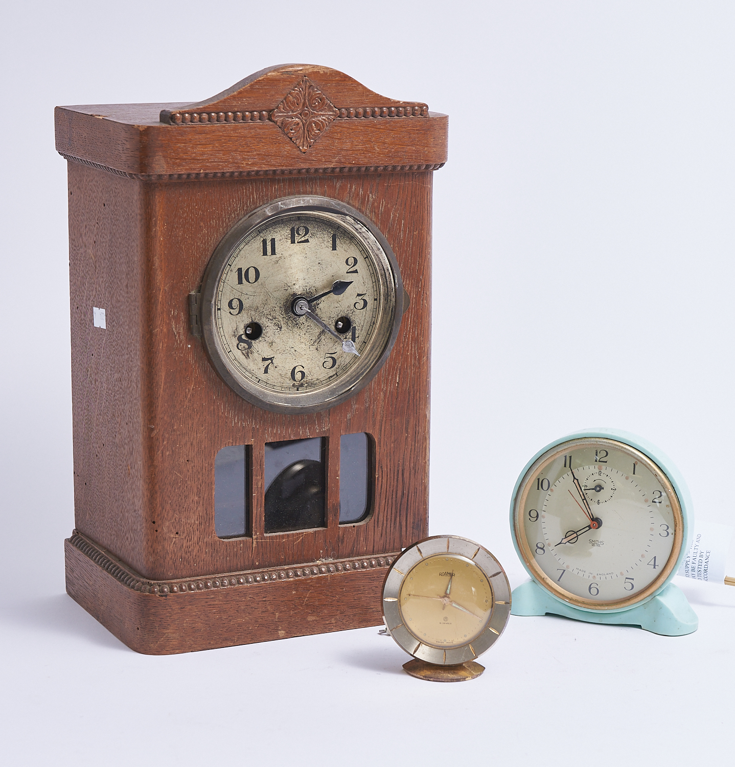 THREE CLOCKS INCLUDING SMITHS, ROAMER AND WOODEN CASE H.35CM (TALLEST), LEONARD JOEL LOCAL DELIVERY: MEDIUM