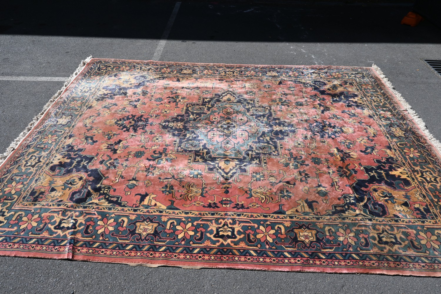 A LARGE HANDMADE WOOLEN RUG IN TRADITIONAL DESIGN WITH CENTRAL MEDALLION (A/F) ( 366 X 274 CM) (PLEASE NOTE THIS HEAVY ITEM MUST BE REMOVED BY CARRIERS AT THE CUSTOMER'S EXPENSE. LEONARD JOEL STAFF CANNOT ASSIST CARRYING THIS ITEM) (X-LARGE ITEM)