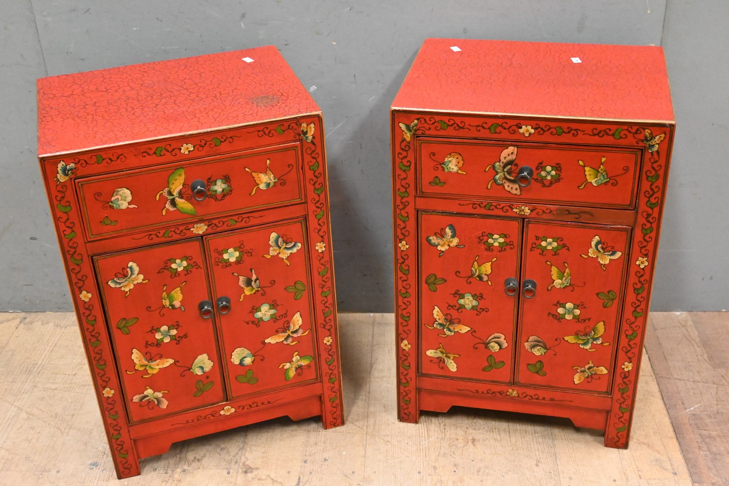 A PAIR OF RED PAINTED CHINESE BEDSIDE CABINETS (60H X 40W X 32D CM) (LEONARD JOEL DELIVERY SIZE: LARGE)