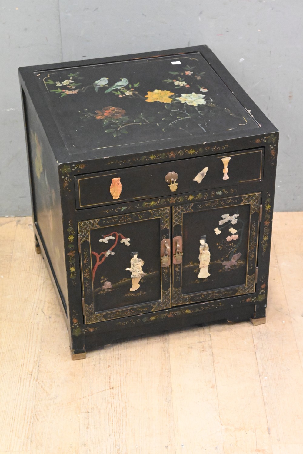 A CHINESE TWO DOOR DECORATIVELY PAINTED CHEST WITH RAISED DETAILING (56H X 51W X 51D CM) (LEONARD JOEL DELIVERY SIZE: LARGE)