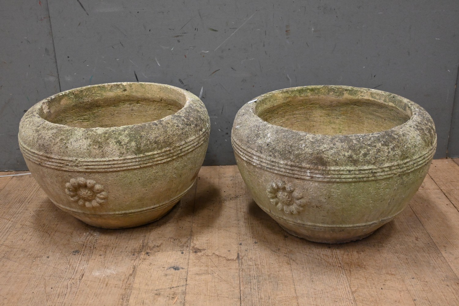 A PAIR OF MID CENTURY CONCRETE POTS (A/F) (28H X 46D CM) (PLEASE NOTE THIS HEAVY ITEM MUST BE REMOVED BY CARRIERS AT THE CUSTOMER'S EXPENSE. LEONARD JOEL STAFF CANNOT ASSIST CARRYING THIS ITEM) (X-LARGE ITEM)