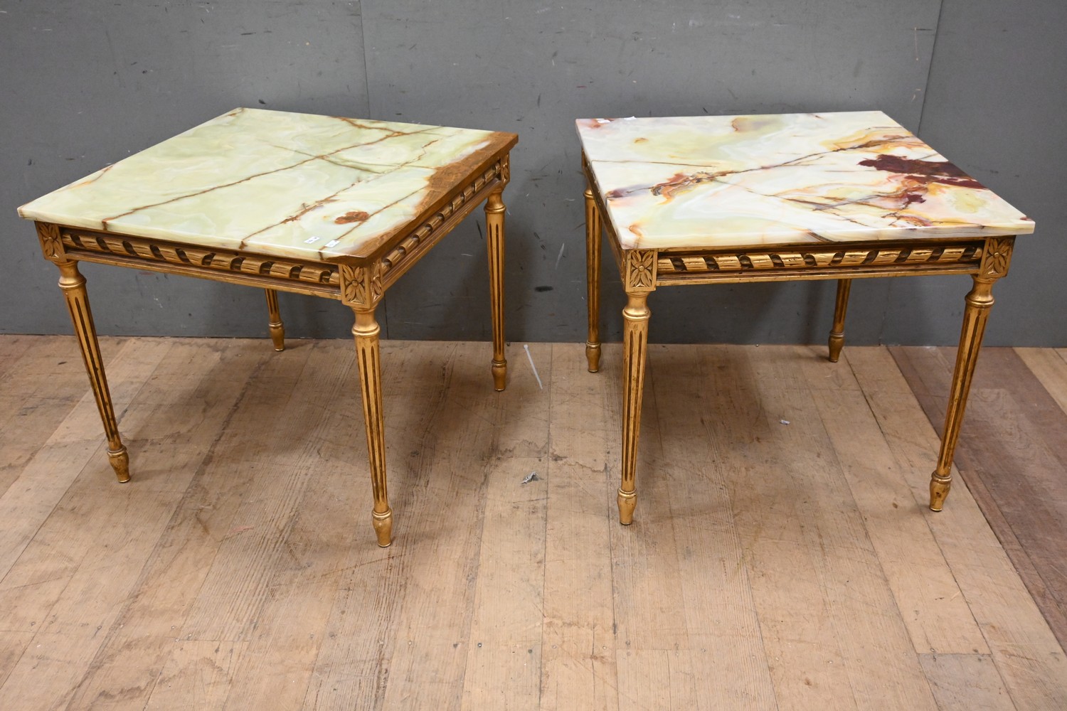 A PAIR OF LOUIS XVI STYLE SIDE TABLES WITH ONYX TOPS (53H X 60W X 60D CM) (PLEASE NOTE THIS HEAVY ITEM MUST BE REMOVED BY CARRIERS AT THE CUSTOMER'S EXPENSE. LEONARD JOEL STAFF CANNOT ASSIST CARRYING THIS ITEM) (X-LARGE ITEM)