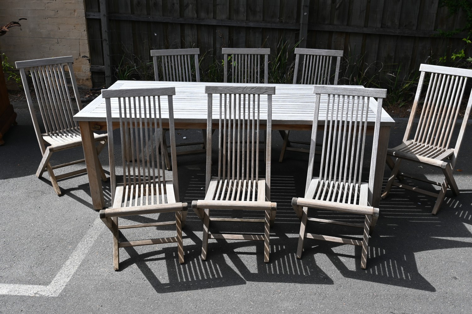 A NINE PIECE JATI OUTDOOR SETTING (A/F) (73H X 210W X 101D CM) (PLEASE NOTE THIS HEAVY ITEM MUST BE REMOVED BY CARRIERS AT THE CUSTOMER'S EXPENSE. LEONARD JOEL STAFF CANNOT ASSIST CARRYING THIS ITEM) (X-LARGE ITEM)