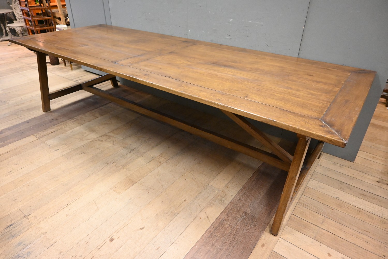 AN OAK TRESTLE STYLE DINING TABLE (77H X 301W X 111D CM) (PLEASE NOTE THIS HEAVY ITEM MUST BE REMOVED BY CARRIERS AT THE CUSTOMER'S EXPENSE. LEONARD JOEL STAFF CANNOT ASSIST CARRYING THIS ITEM) (X-LARGE ITEM)
