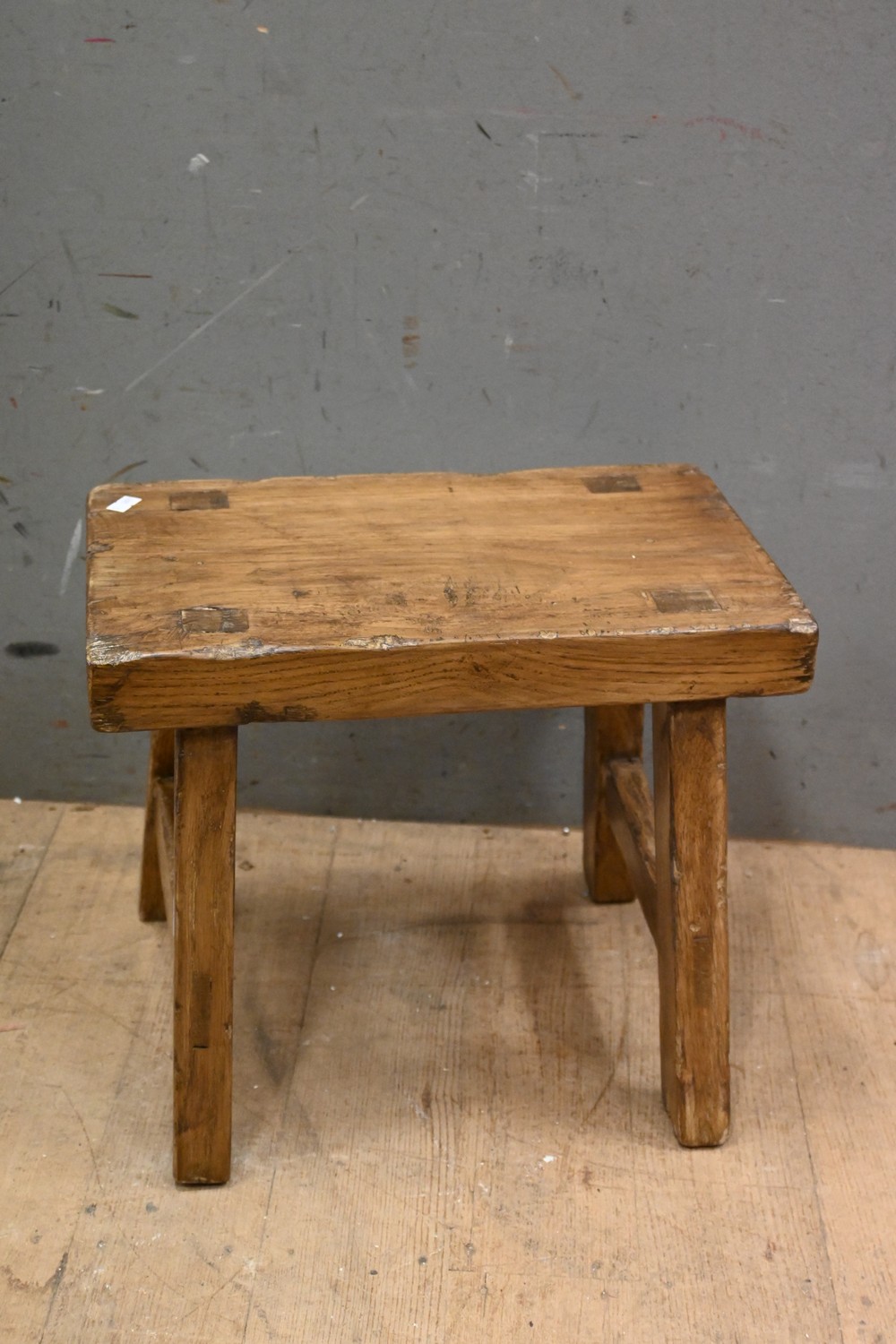 AN OAK FRENCH STYLE MILKING STOOL ( 34H X 41W X 25D CM) (LEONARD JOEL DELIVERY SIZE: MEDIUM)