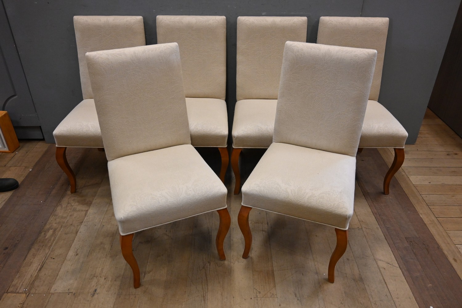 A SET OF SIX LINEN UPHOLSTERED DINING CHAIRS (A/F) (97H X 51W X 64D CM) (LEONARD JOEL DELIVERY SIZE: LARGE)