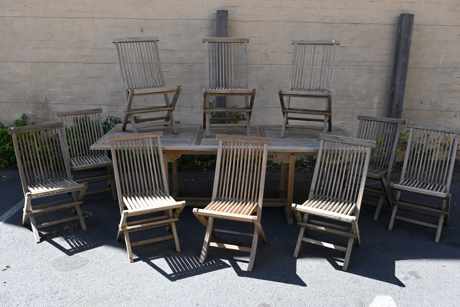 A TEAK ELEVEN PIECE EXTENSION OUTDOOR SETTING (A/F) (74H X 241W X 90D CM) (PLEASE NOTE THIS HEAVY ITEM MUST BE REMOVED BY CARRIERS AT THE CUSTOMER'S EXPENSE. LEONARD JOEL STAFF CANNOT ASSIST CARRYING THIS ITEM) (X-LARGE ITEM)