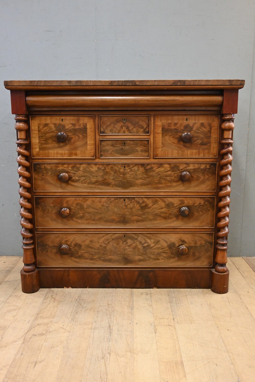 A LARGE FLAME MAHOGANY VICTORIAN CHEST OF DRAWERS WITH BARLEY TWIST DETAILING (A/F) (126H X 132W X 61D CM) (PLEASE NOTE THIS HEAVY ITEM MUST BE REMOVED BY CARRIERS AT THE CUSTOMER'S EXPENSE. LEONARD JOEL STAFF CANNOT ASSIST CARRYING THIS ITEM) (X-LARGE ITEM)