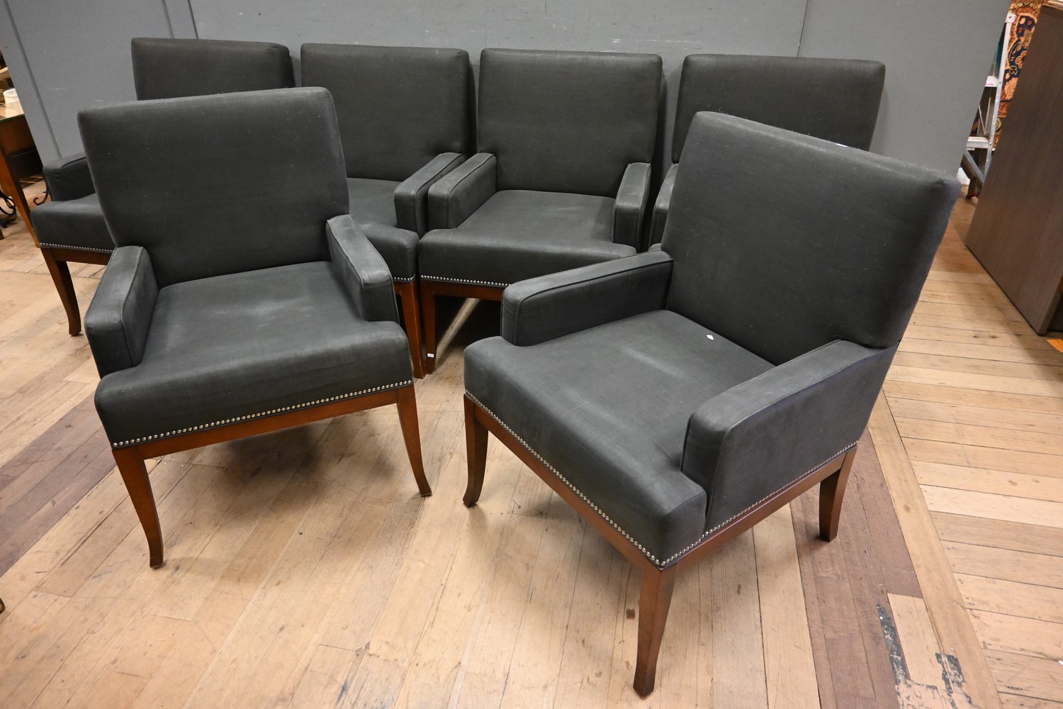 A SET OF SIX LARGE DINING CHAIRS IN CHARCOAL UPHOLSTERY WITH STUDDED DETAILING (A/F) (96H X 66W X 80D CM) (PLEASE NOTE THIS HEAVY ITEM MUST BE REMOVED BY CARRIERS AT THE CUSTOMER'S EXPENSE. LEONARD JOEL STAFF CANNOT ASSIST CARRYING THIS ITEM) (X-LARGE ITEM)