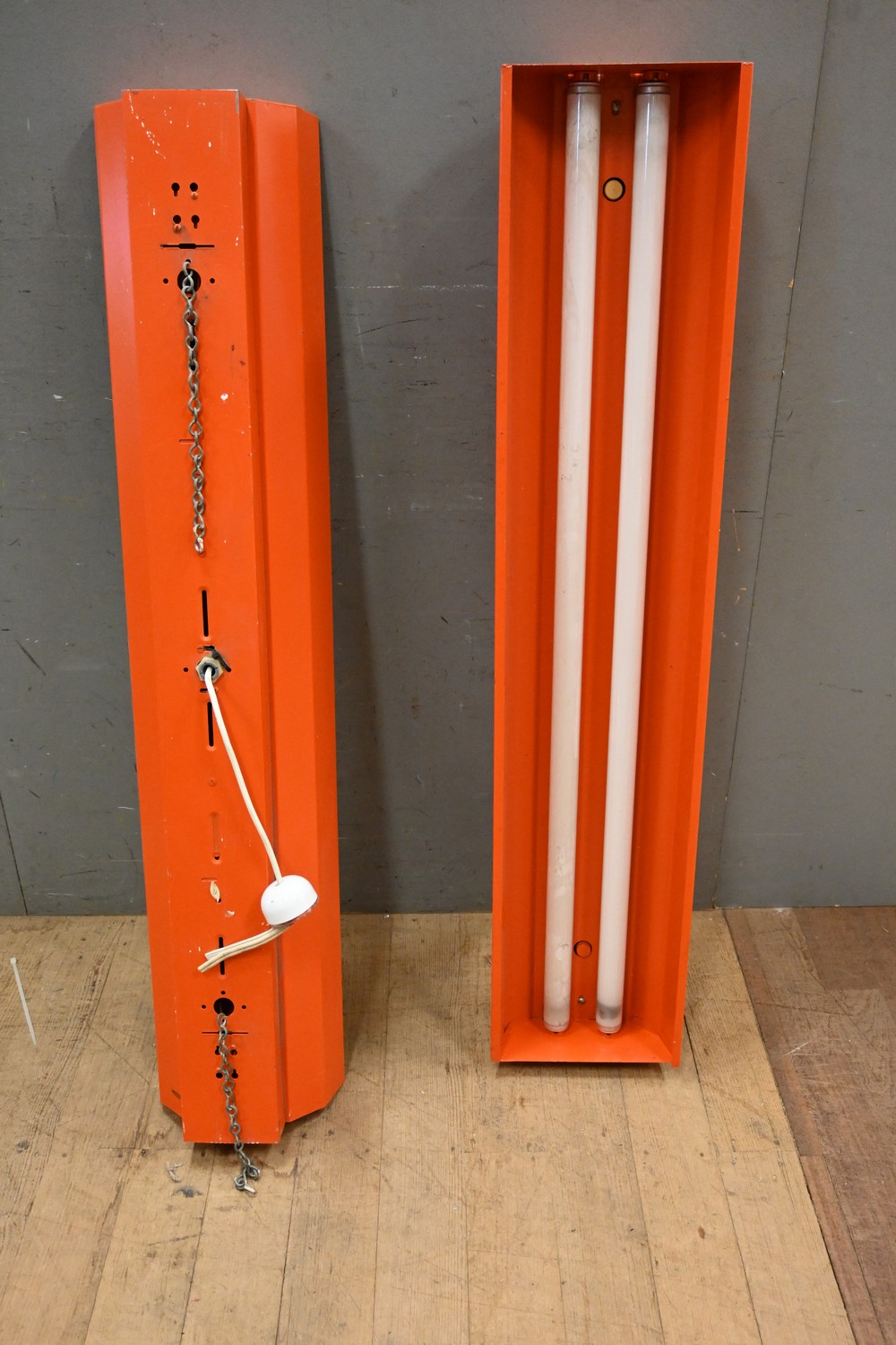 A PAIR OF RETRO ORANGE FLOURESCENT LIGHT FITTINGS (A/F) (125H X 26W X 18D CM) (LEONARD JOEL DELIVERY SIZE: LARGE)