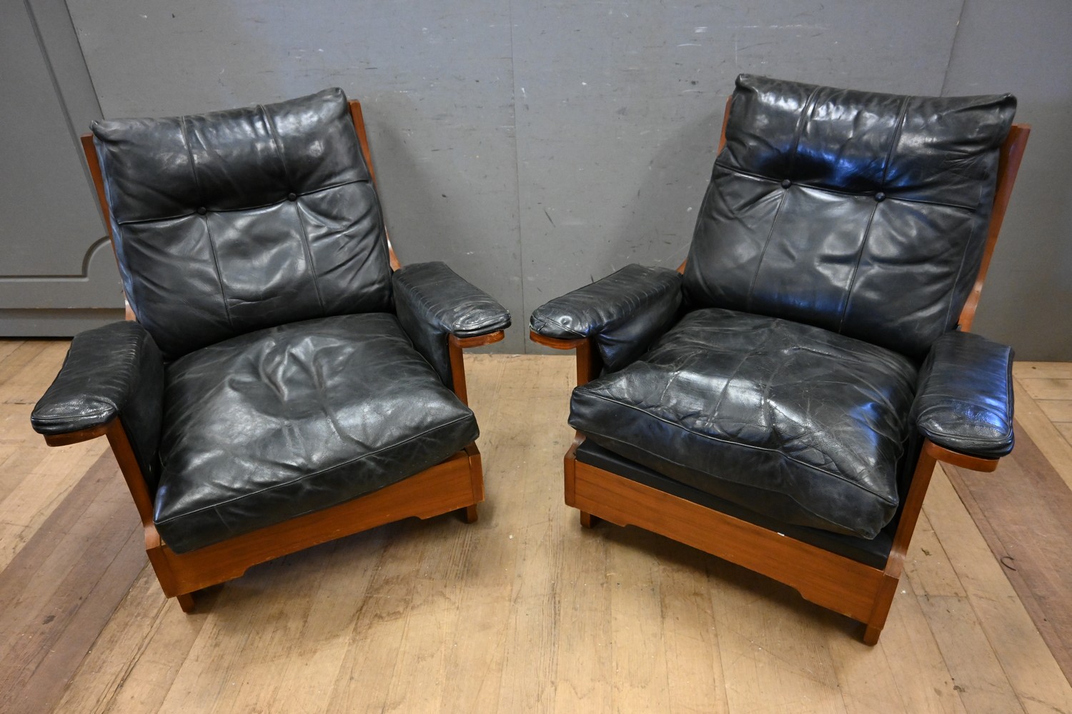 PAIR OF MID CENTURY ITALIAN LEATHER AND WALNUT ARM CHAIRS, C.1960'S ( A/F) ( 84H X 86W X 100 CM) (PLEASE NOTE THIS HEAVY ITEM MUST BE REMOVED BY CARRIERS AT THE CUSTOMER'S EXPENSE. LEONARD JOEL STAFF CANNOT ASSIST CARRYING THIS ITEM) (X-LARGE ITEM)