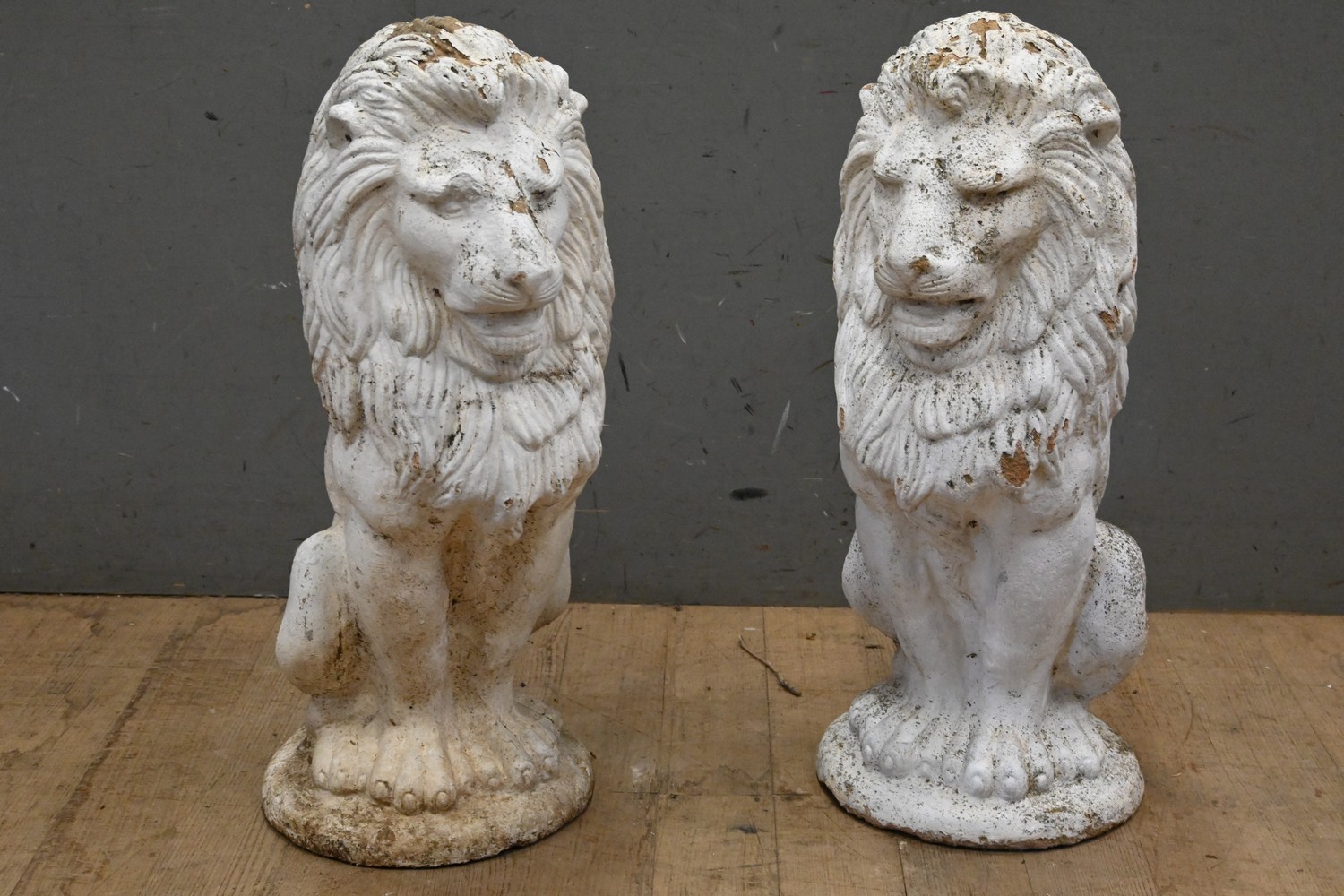 A PAIR OF RECONSTITUTED STONE LIONS (A/F) (75H CM) (PLEASE NOTE THIS HEAVY ITEM MUST BE REMOVED BY CARRIERS AT THE CUSTOMER'S EXPENSE. LEONARD JOEL STAFF CANNOT ASSIST CARRYING THIS ITEM) (X-LARGE ITEM)