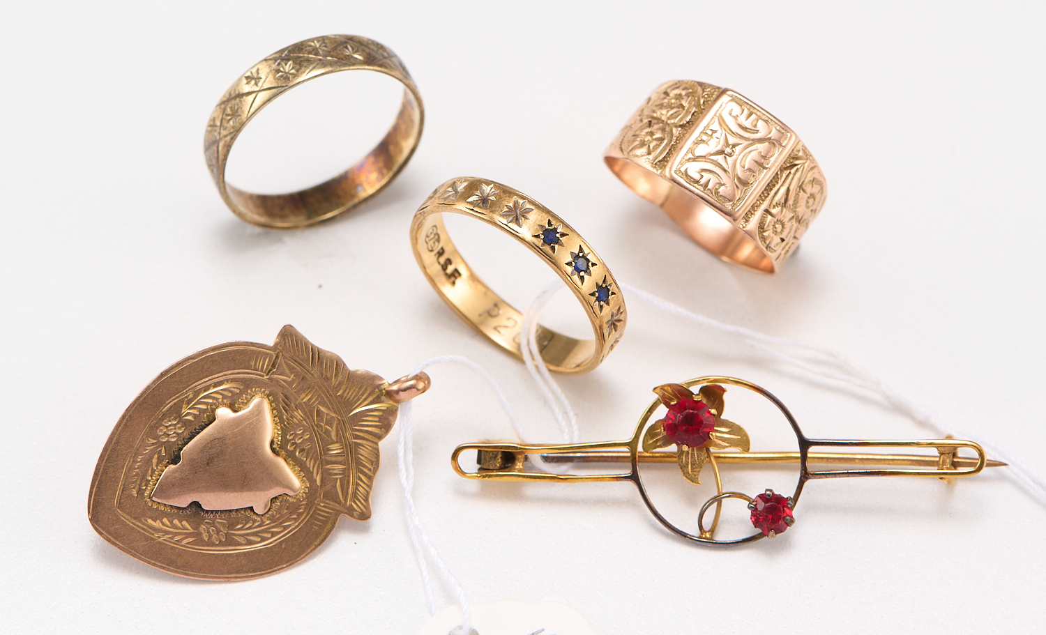 A COLLECTION OF JEWELLERY IN 9CT GOLD (BROOCH IN GOLD PLATE), TOTAL WEIGHT OF THOSE IN 9CT GOLD 9.5GMS