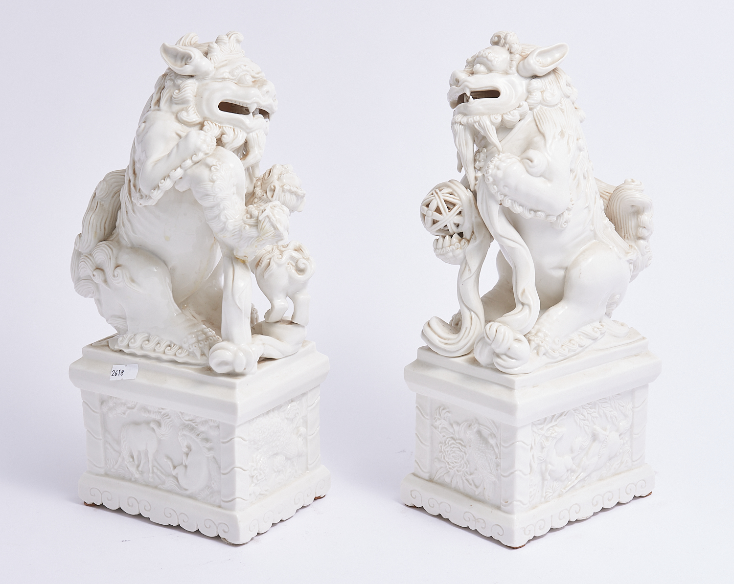 A PAIR OF WHITE GLAZED CERAMIC FOO DOGS H.36CM, LEONARD JOEL LOCAL DELIVERY: MEDIUM