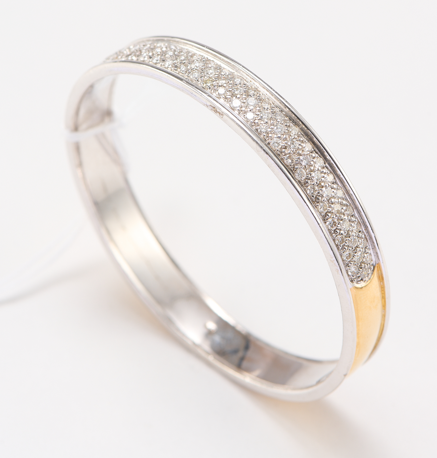 A DIAMOND SET BANGLE IN TWO TONE 18CT GOLD, THE DIAMONDS TOTALLING 2.07 CARATS (G-J, SI2-PIQUÉ), INNER DIAMETER 60MM, WITH VALUATION, 50.7GMS