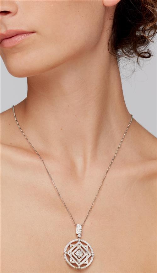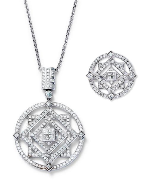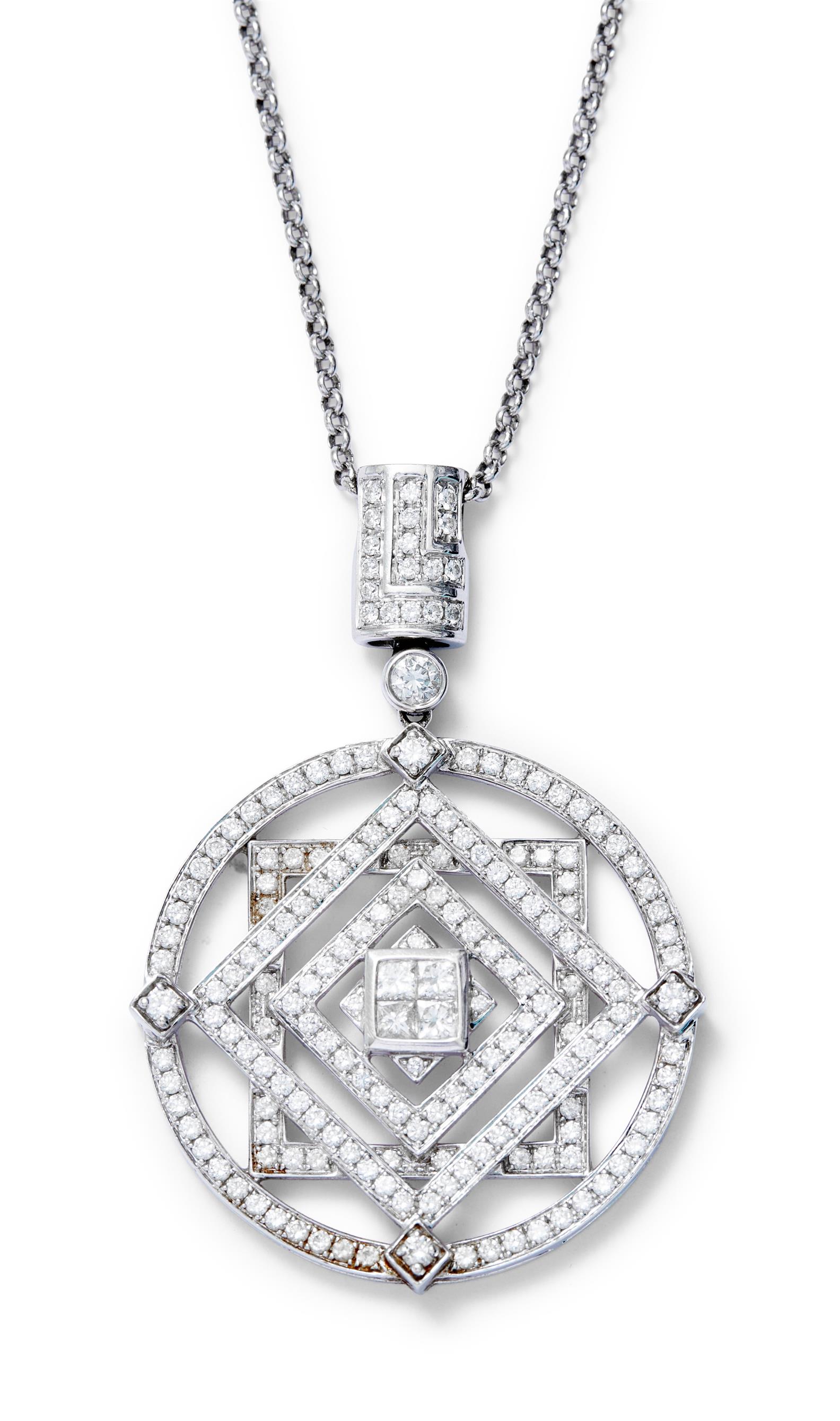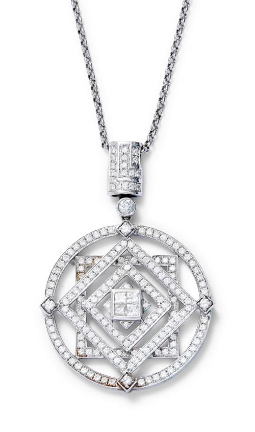 Comprising: an 18ct white gold pendant necklace of openwork geometric design set with princess and brilliant-cut diamonds, width 33mm, length 48mm, supported from a 9ct white gold chain, length 600mm; an 18ct white gold diamond ring of similar design, size N (2).