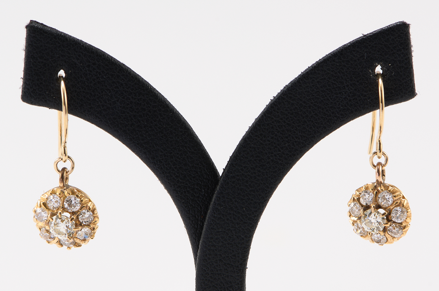 A PAIR OF ANTIQUE DIAMOND CLUSTER EARRINGS IN 18CT AND 9CT GOLD, TO SHEPHERD HOOK FITTINGS, THE DIAMONDS TOTALLING APPROXIMATELY 1.38CTS (MEASURED IN SETTING), CLUSTER DIAMETER 9MM, 3.0GMS
