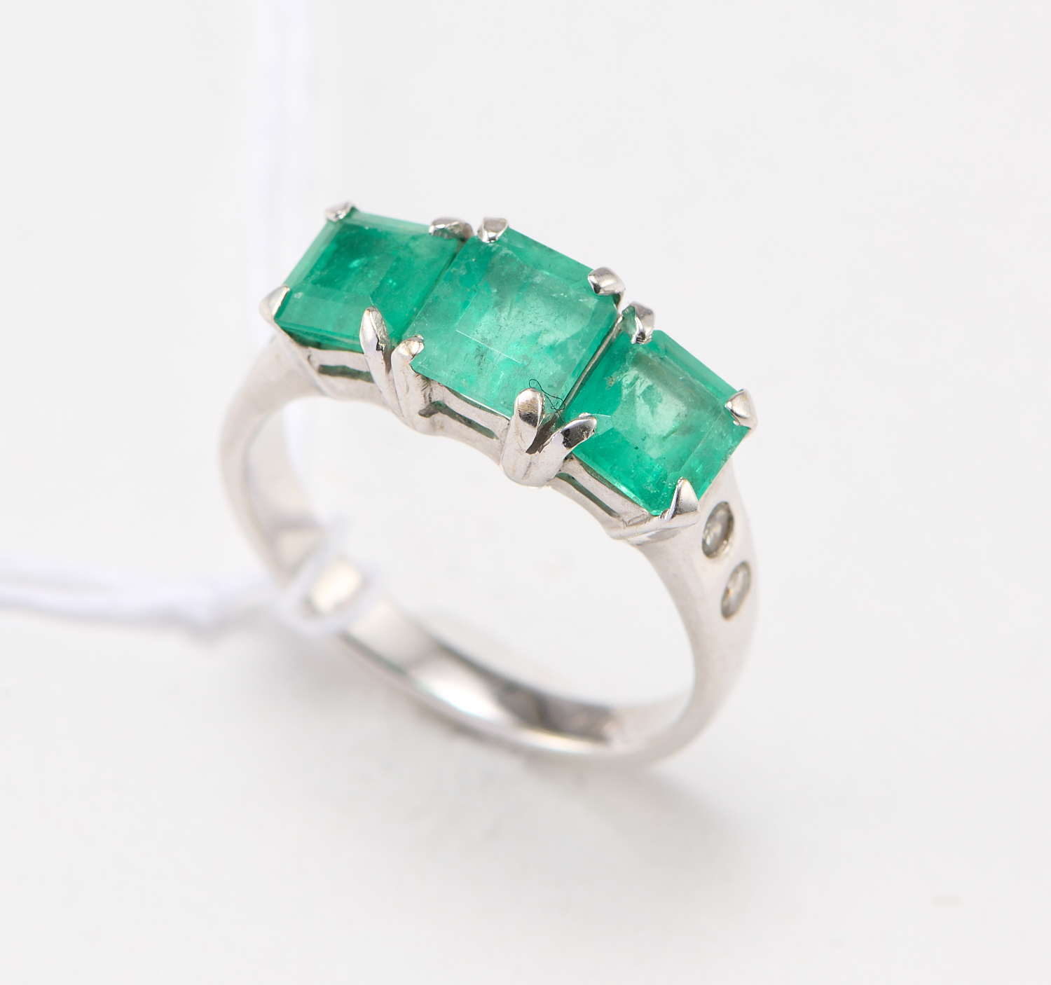 A THREE STONE DIAMOND RING IN WHITE GOLD, THE DIAMONDS TOTALLING 1.77CTS, RING SIZE M